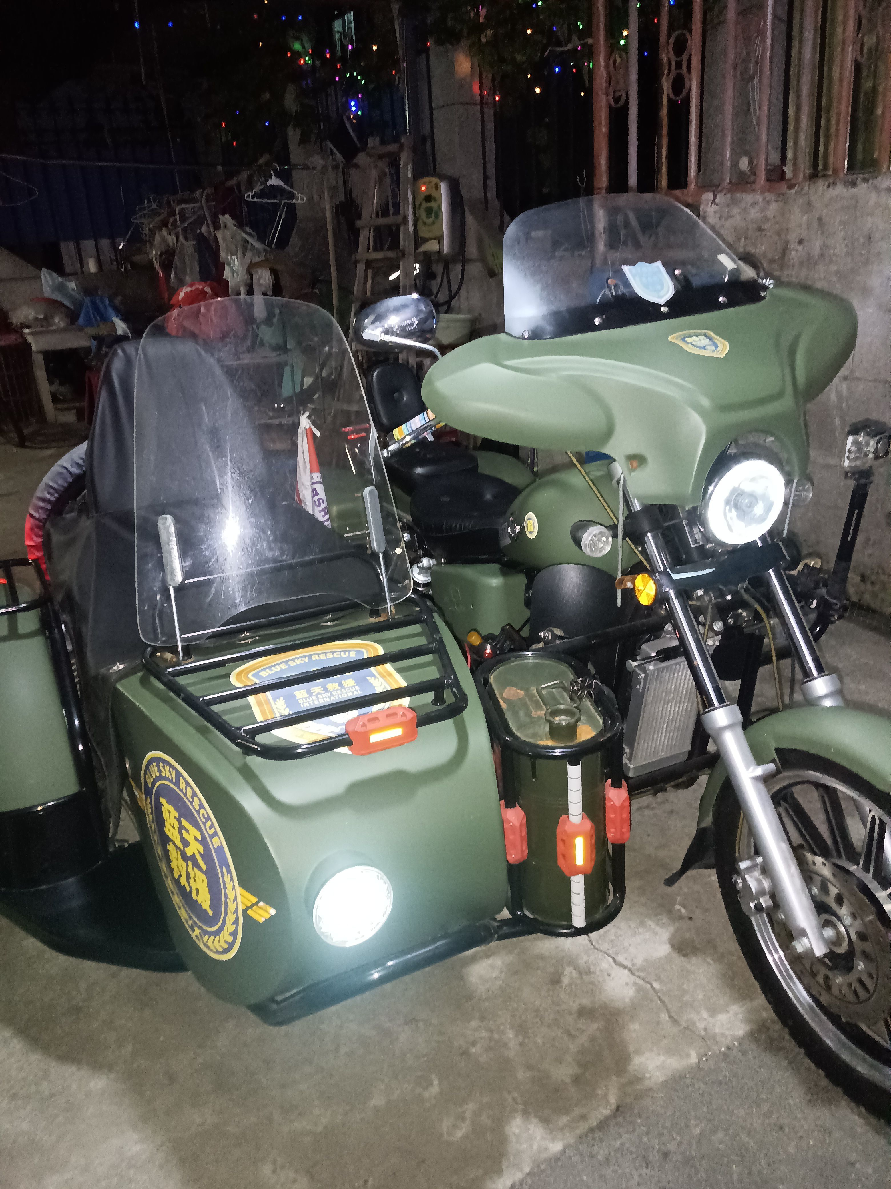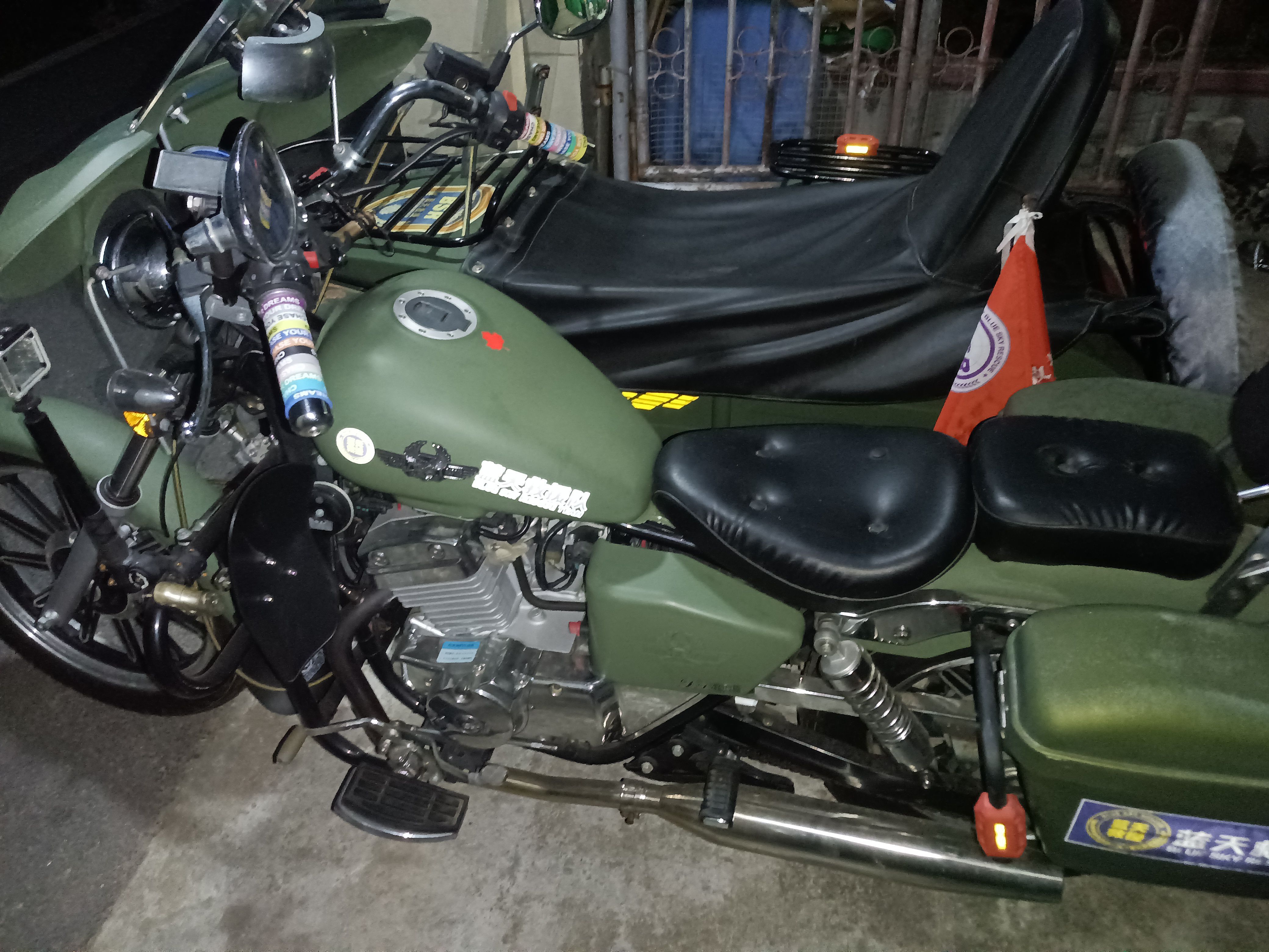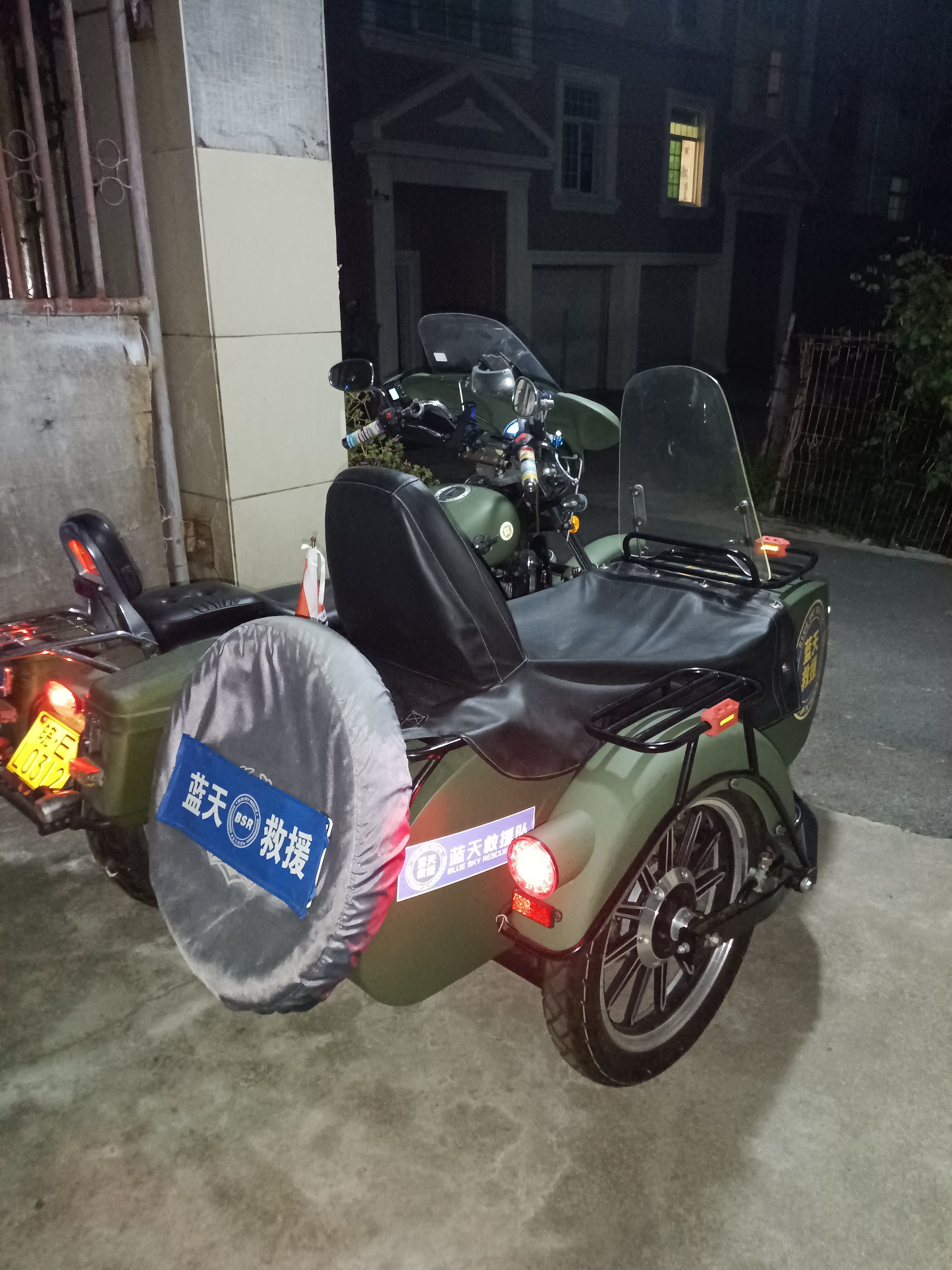 大地鹰王DD400B边三轮摩托车,巡航太子款,双缸水冷,军绿色。22年10月份上牌的行驶一千多两千不到的公里数,几乎全新,不常开,车况好,证件齐全,整车无事故,加装边篼挡风板,边篼防雨棚,主驾前挡风,主驾后边箱。配备胎压监测,电瓶断电开关。LED大灯灯泡。后尾箱杠。旗杆。必须过户。