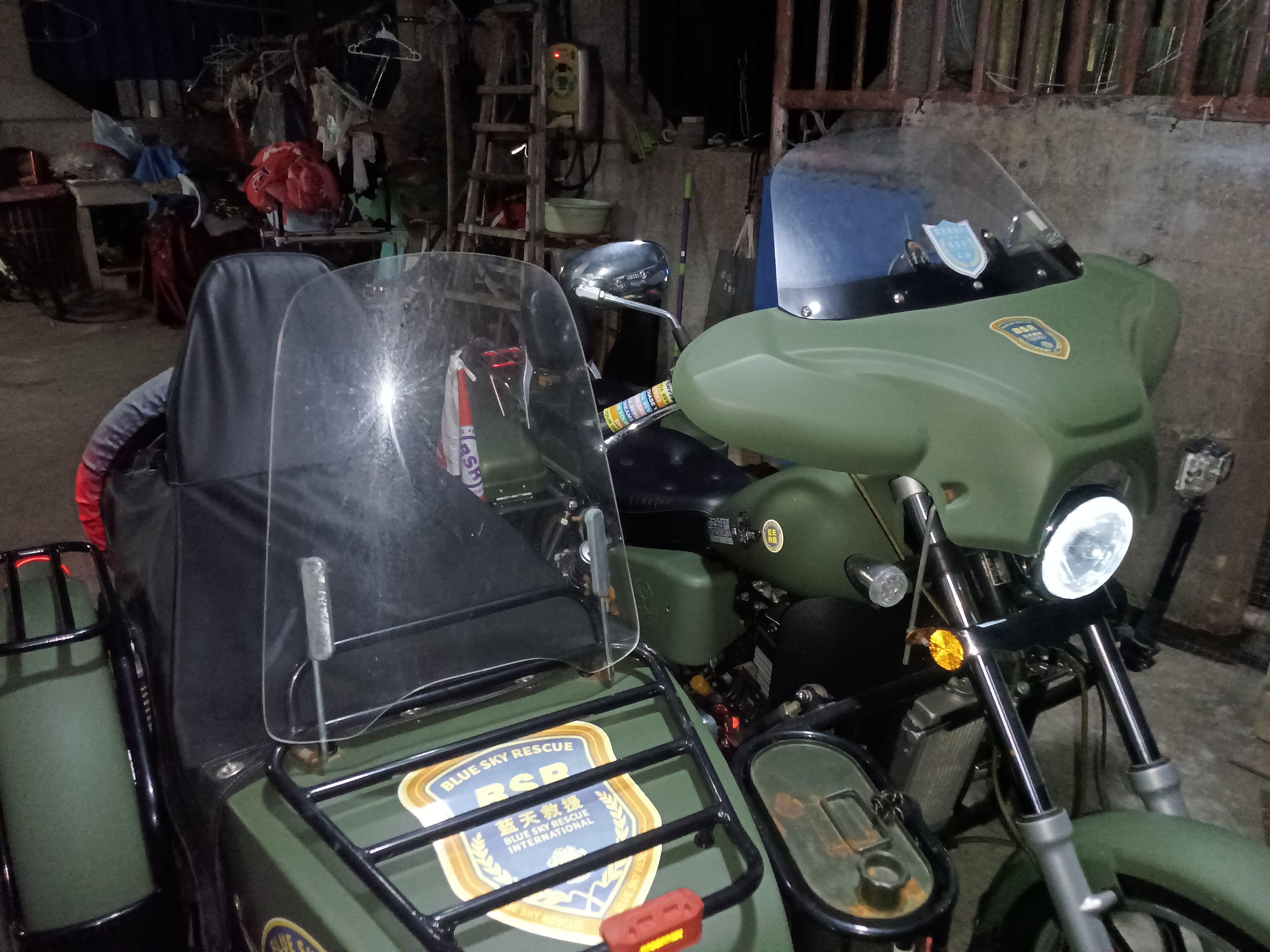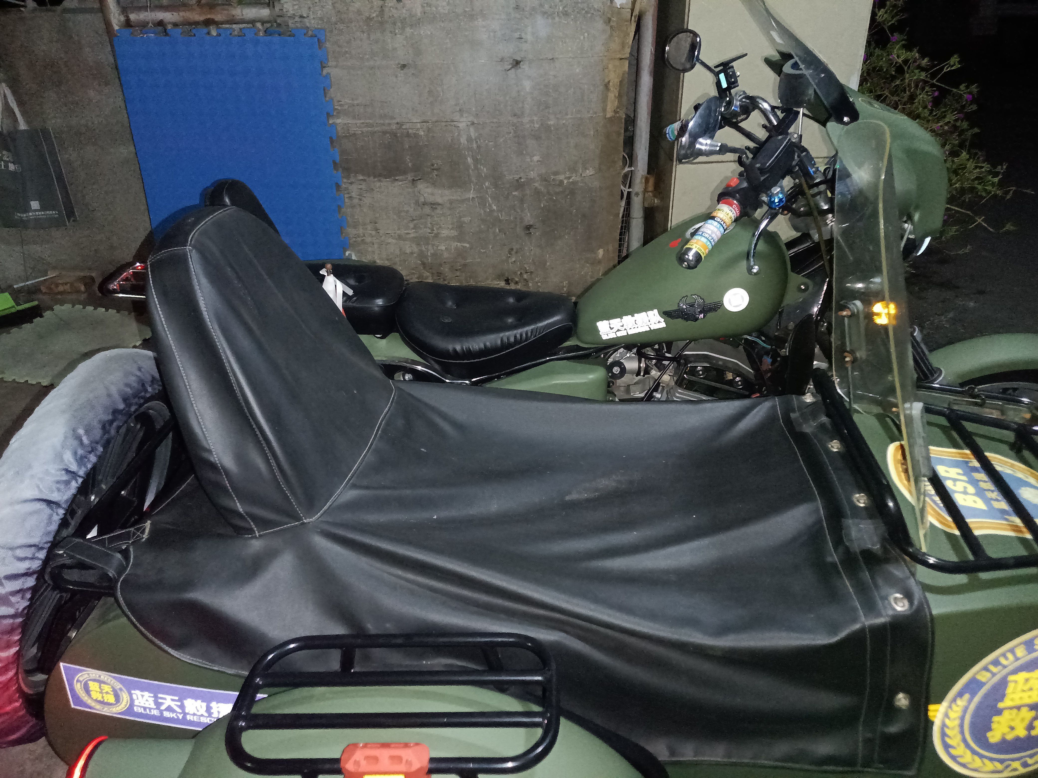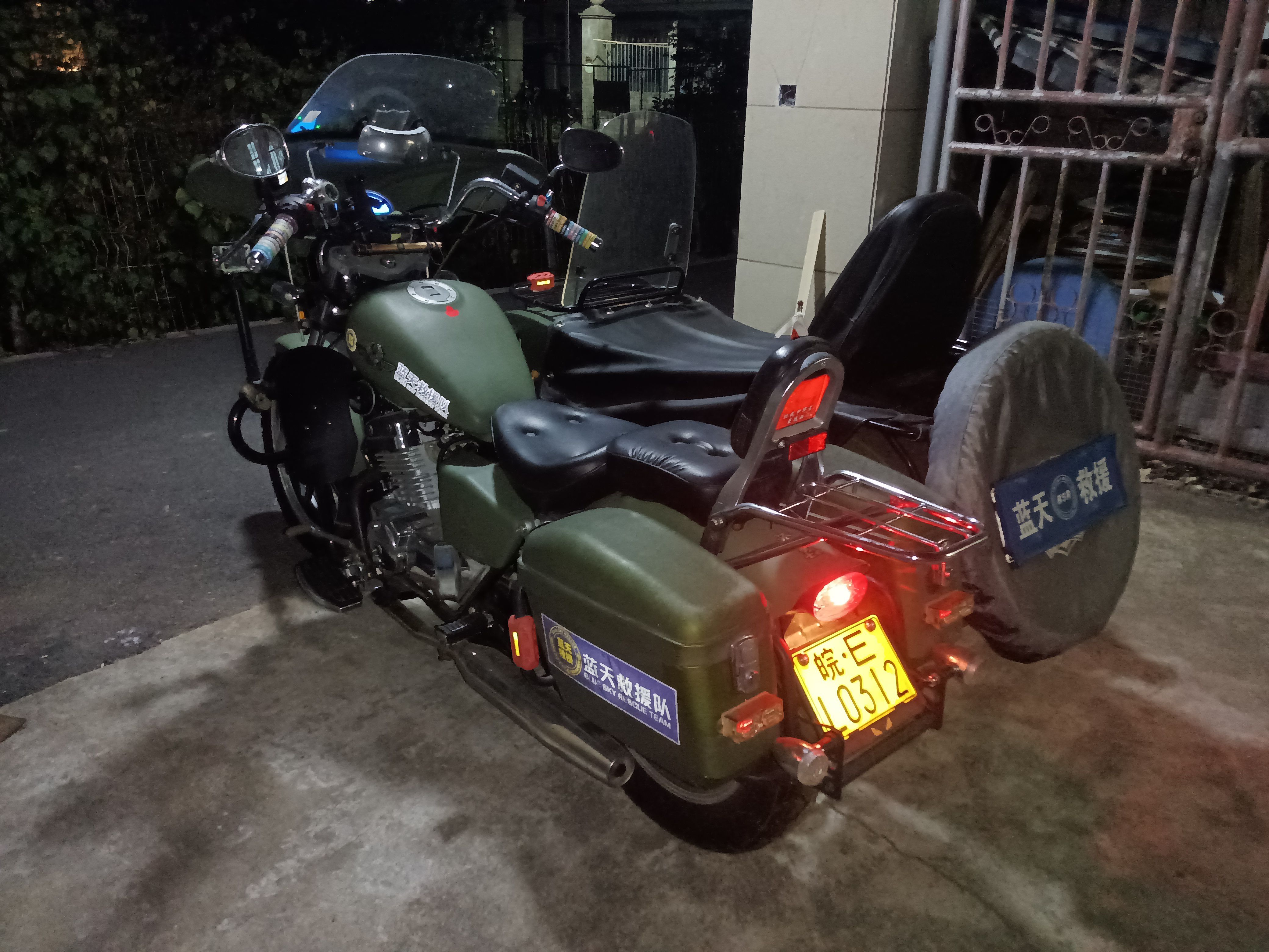 大地鹰王DD400B边三轮摩托车,巡航太子款,双缸水冷,军绿色。22年10月份上牌的行驶一千多两千不到的公里数,几乎全新,不常开,车况好,证件齐全,整车无事故,加装边篼挡风板,边篼防雨棚,主驾前挡风,主驾后边箱。配备胎压监测,电瓶断电开关。LED大灯灯泡。后尾箱杠。旗杆。必须过户。