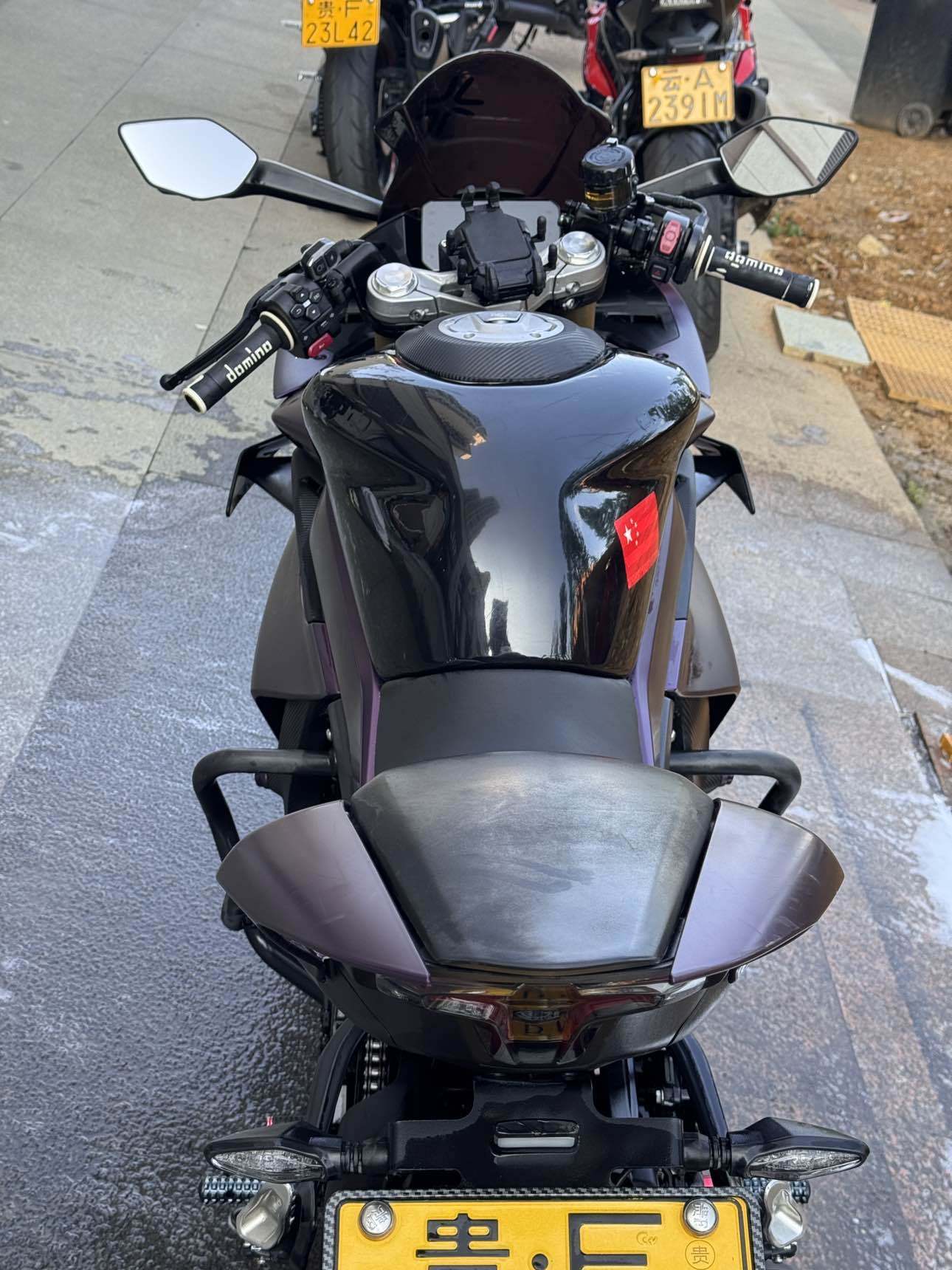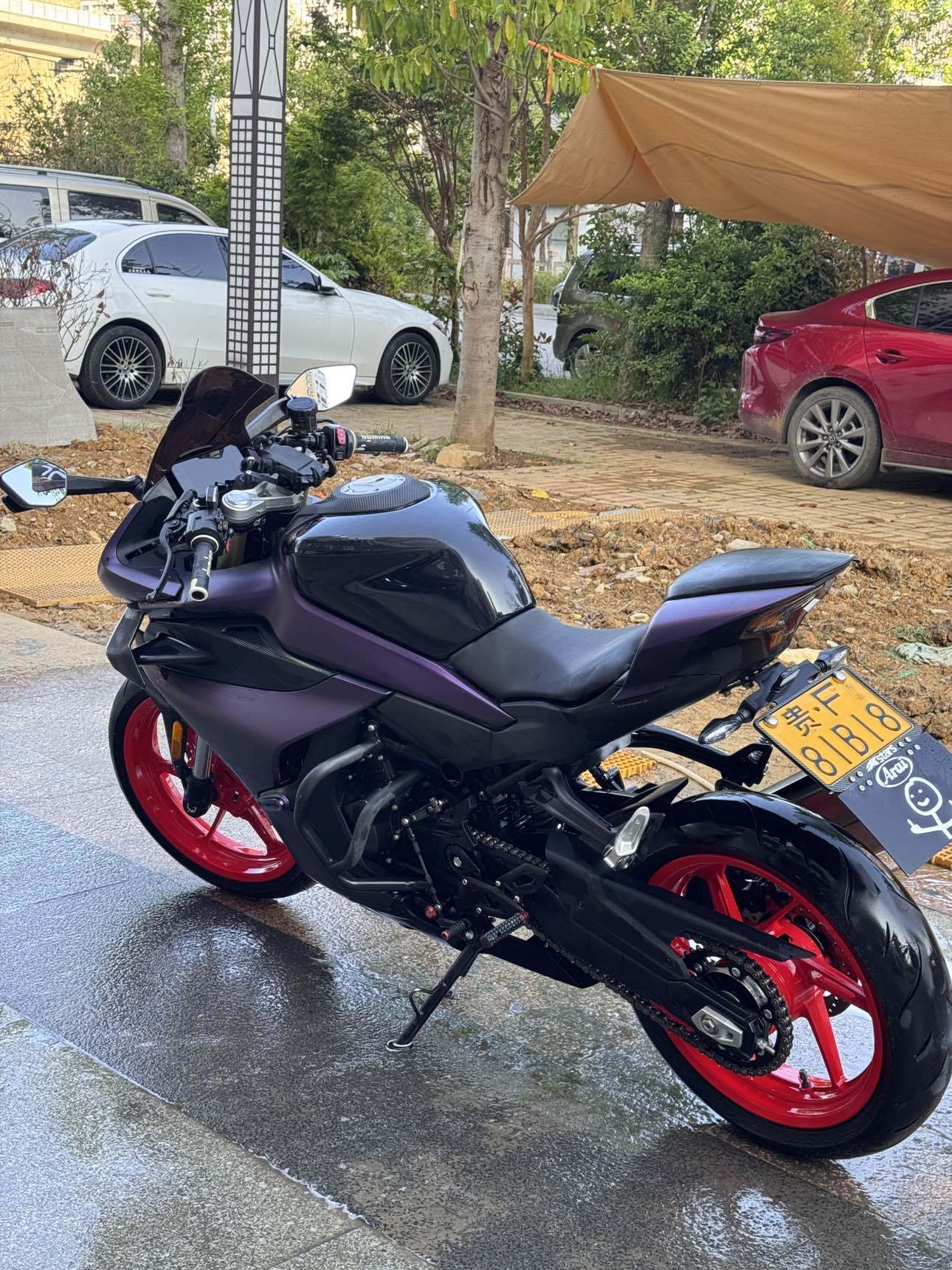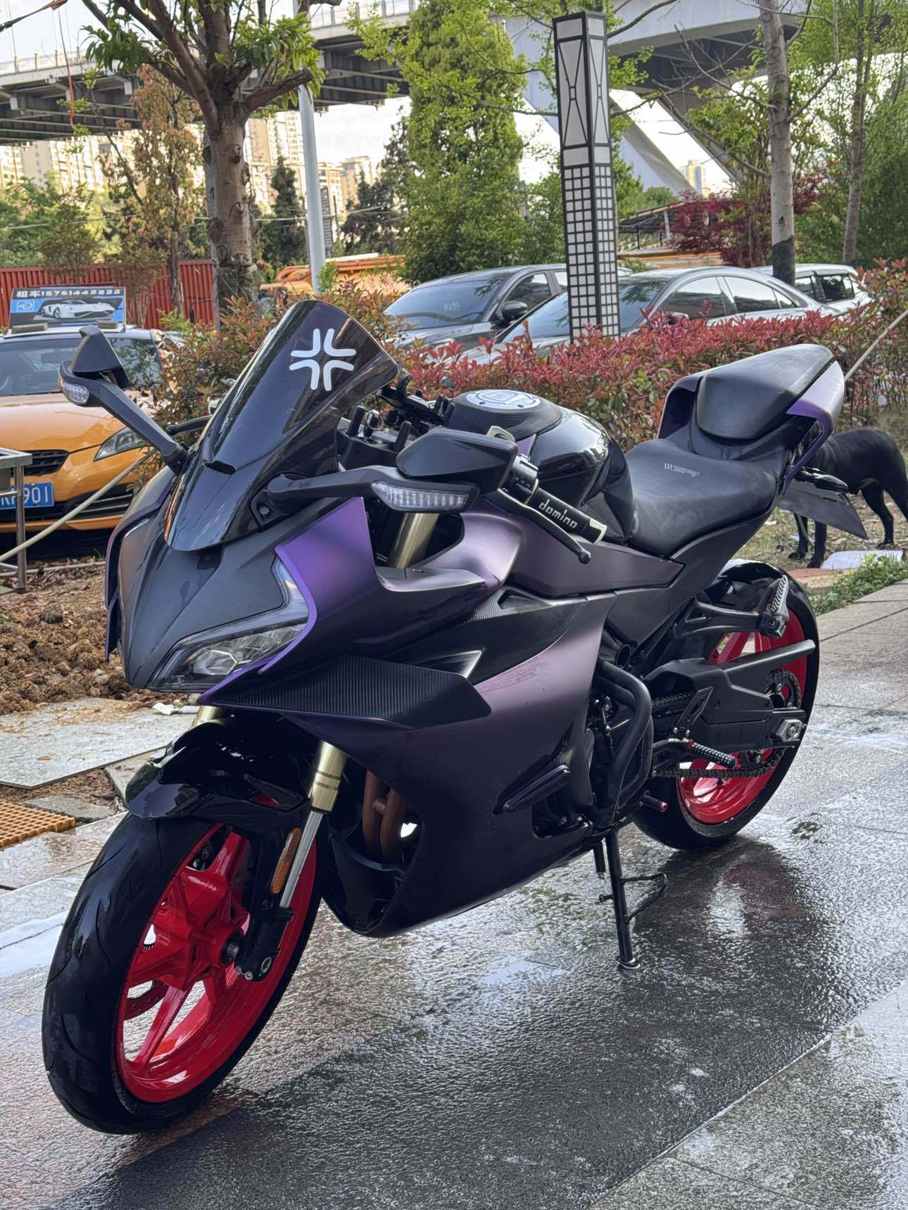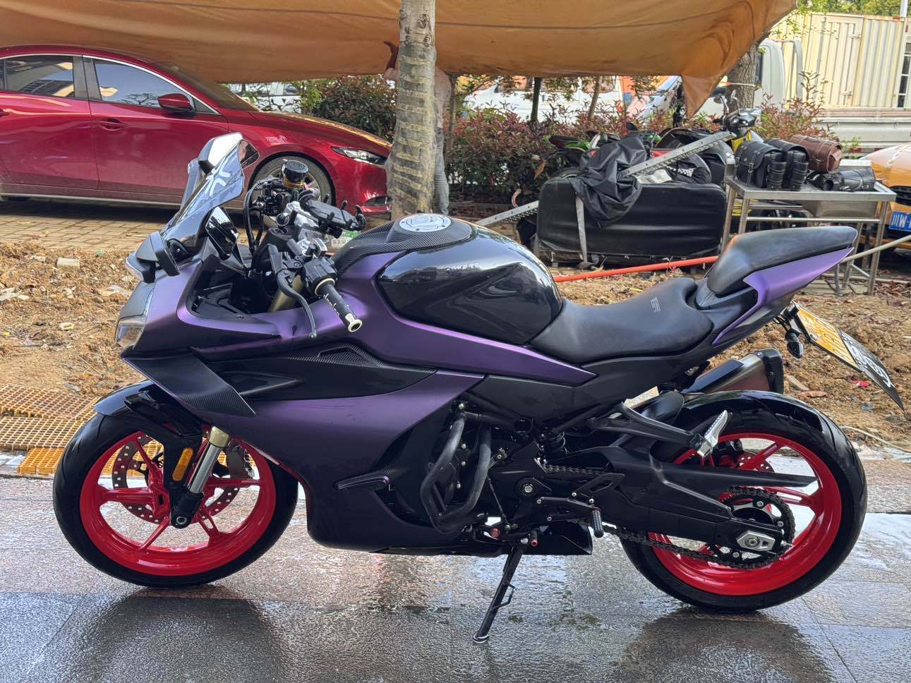 春风450SR,24年车子,二手户,14500公里,车况成色精品,加装:护杠、未来之眼射灯、短尾、风挡、全车紫色膜。