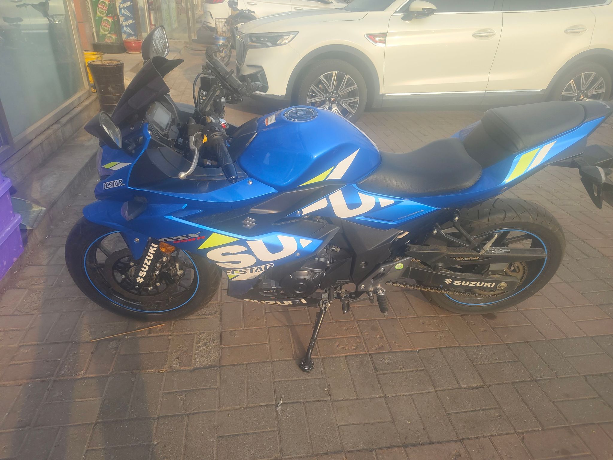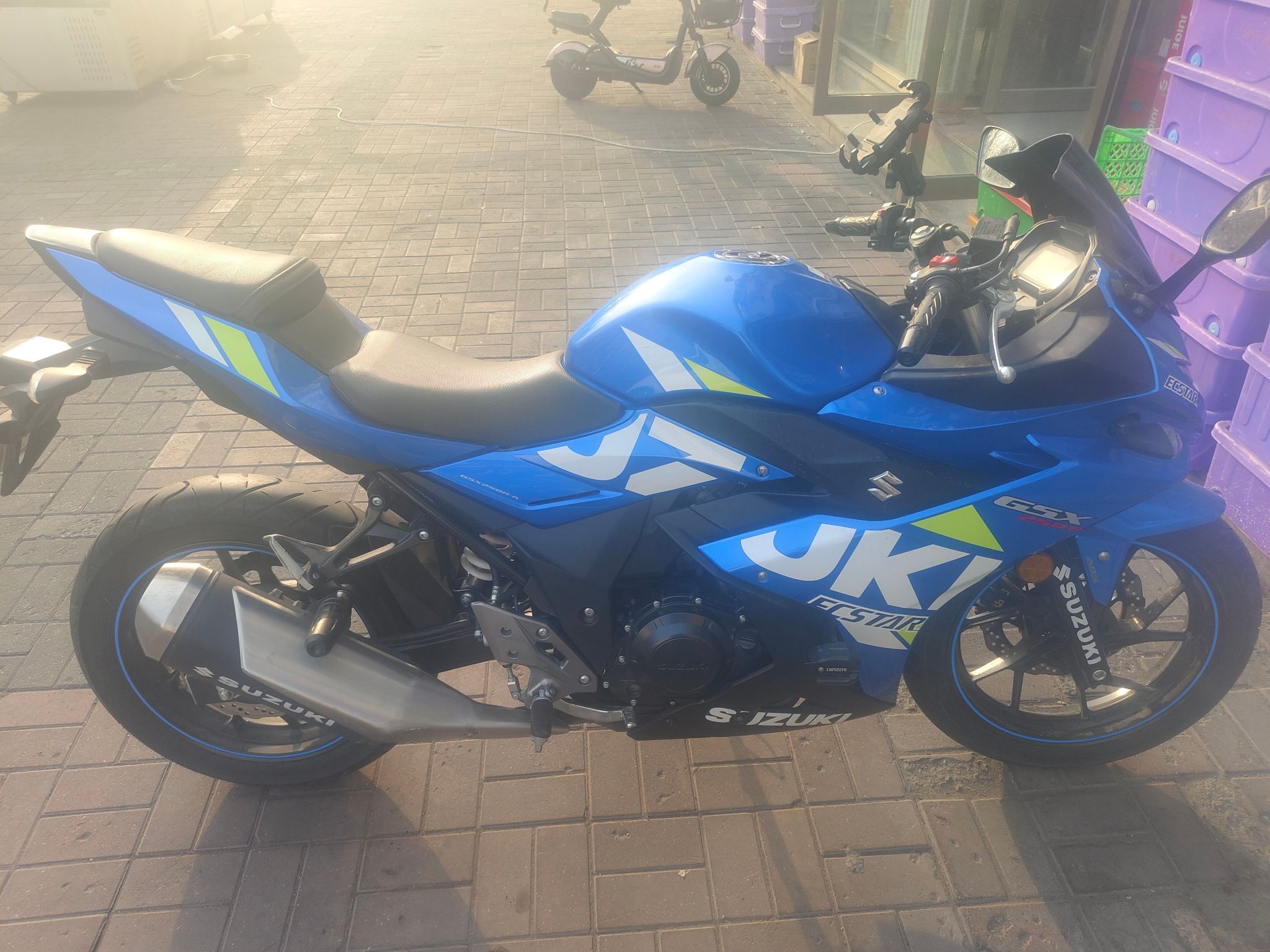 铃木gsx250 蓝色,11000公里,成色几乎全新,平时骑的少,基本没怎么用,一直放地库,车况很棒~ 加装了手机支架、护杠、更换了风挡,骑着舒服,动力没问题,手续齐全,必须过户 换车了,想换大排量,这台低价转,价格好聊,喜欢可以来看车,支持自提。