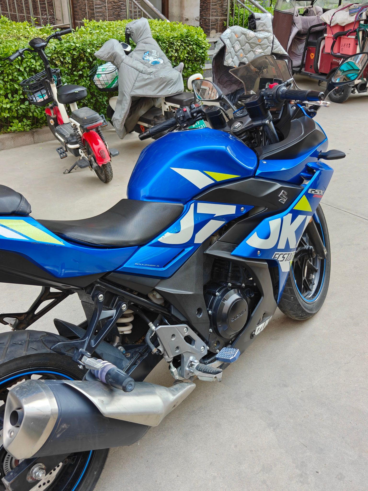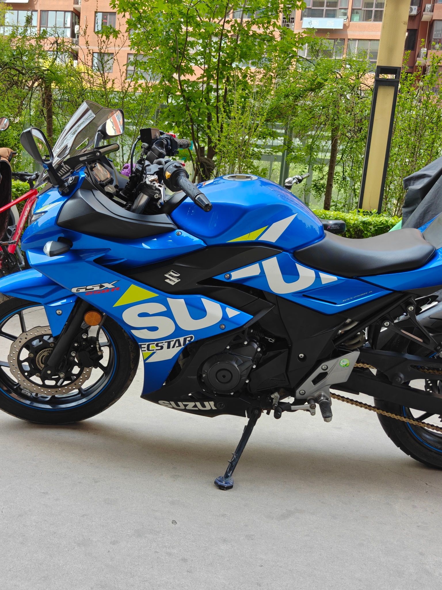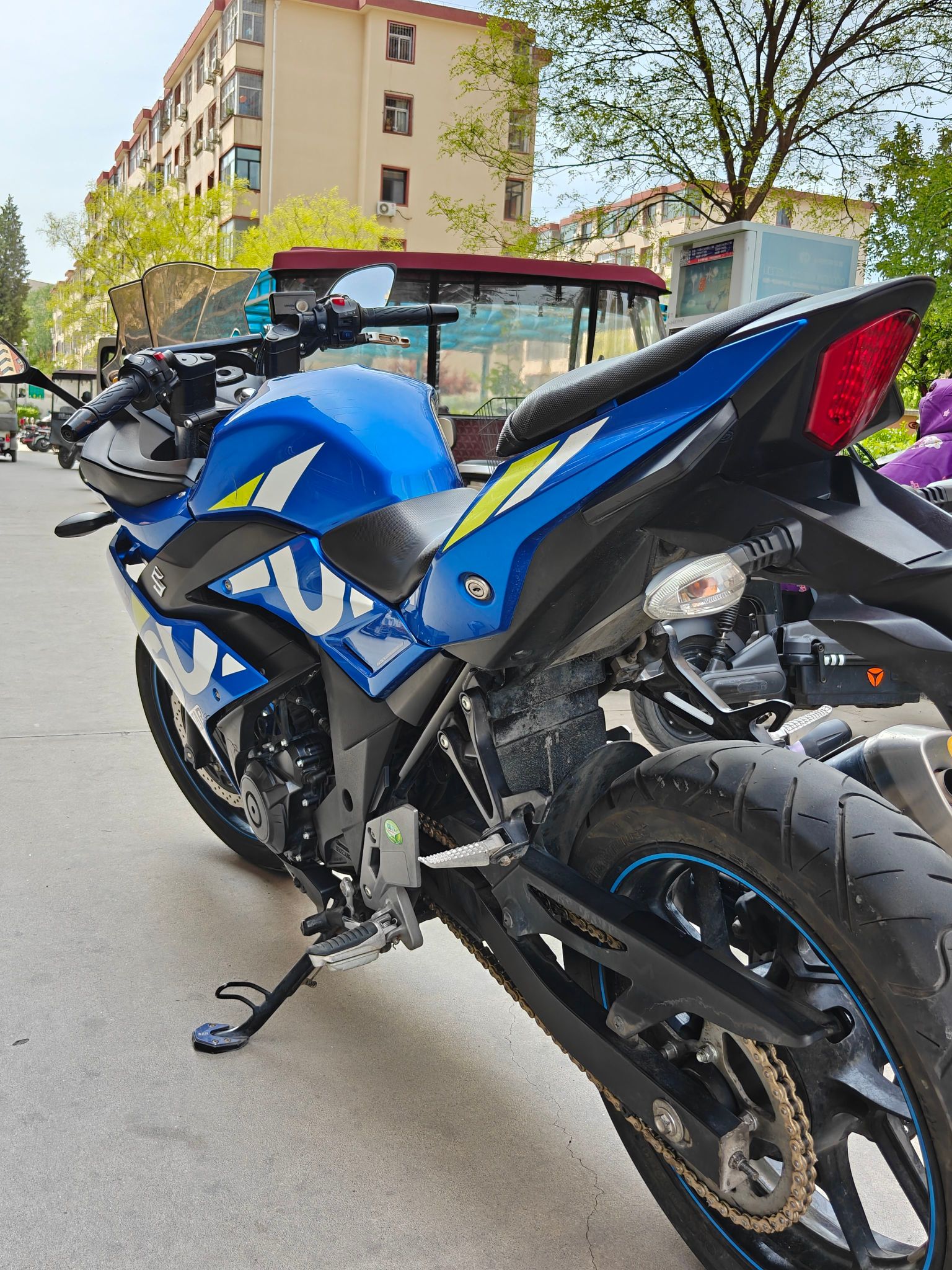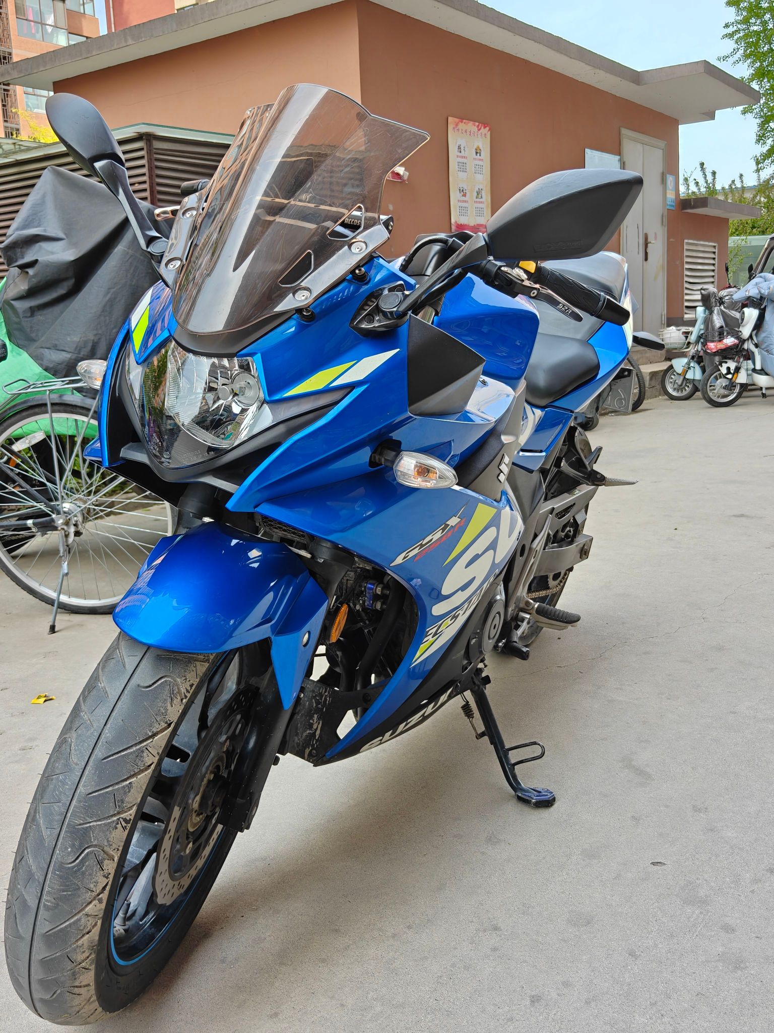 铃木gsx250 整车9成新,新做的保养,公里数10800公里 没怎么骑,发动机无敌状态,发动机声音跟新车没区别,只有轻微使用痕迹 整车9.7成新,一车一况一价格,带侧撑熄火,前后abs,改装led大灯,超级海神蓝配色,车况无敌!跑山神器!前面刹车有点气,自己骑回去,放放气就好了! 仿赛,二手摩托车!