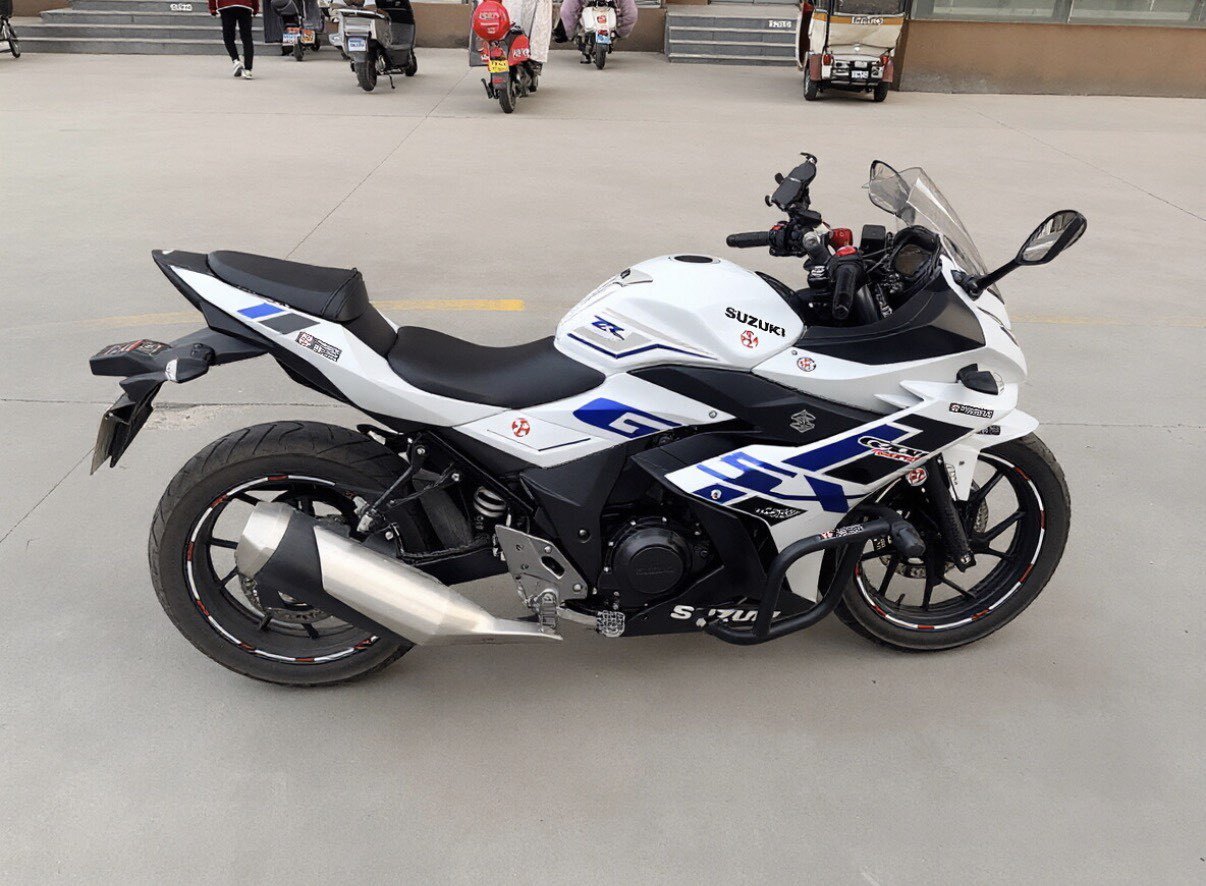 23年铃木GSX250R,白色蓝黑拉花,手续齐全,表显7500多公里,绝对实表,成色还可以,平时用得少,动力足,操控顺手,适合新手练手或者日常通勤。